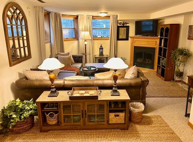 The large living room area with leather sectional, coffee tables, corner Victorian-style fireplace, 43" Roku TV, pillow-top King bed with 3" memory foam topper and private attached Kohler bathroom with shower, complete the space.
