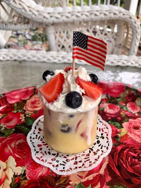 • Four glasses of smoothies with raspberries and whipped cream on top.